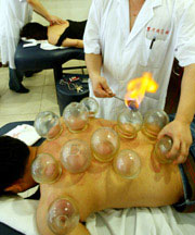 5.温罐:冬季或深秋、初春、天气寒冷、拔罐前为避免患者有寒冷感,可预先将罐放在火上燎烤。温罐时要注意只烤烘底部,不可烤其口部,以防过热造成烫伤。温罐时间,以罐子不凉和皮肤温度相等,或稍高于体温为宜。