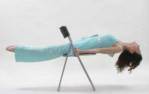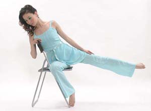 动作要领:斜靠在椅背上,双脚离地,坚持一会儿,反方向再做一次。