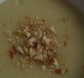 做法:核桃仁、松子仁、大杏仁放入平底锅内用小火慢慢烘焙出香味。将烘焙好的核桃仁和大杏仁切成碎粒。将黄豆豆渣与玉米面混合,加入适量凉水调成糊。
