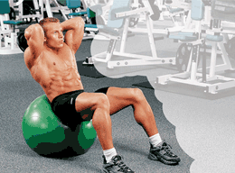 平躺在健身球上做卷腹动作效果也不错:上身平躺在健身球上,双脚平放于地,手臂打开,平放头侧;下颏向胸前微收,呼气,收缩腹肌抬起上身约45度,保持2秒;然后慢慢回到开始姿势。两脚分开时难度较低,若想增加难度,可以将双脚并起来做。