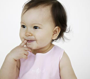 扶床能站,会用拇指和其他指前端去拿葡萄干大小的物品,能将手掌蒙在脸上不让母亲给他洗脸。