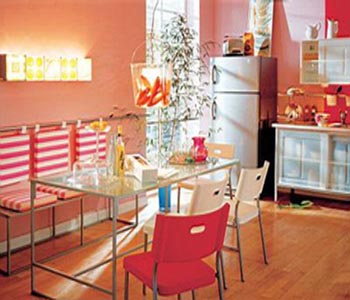 家具的色彩往往会左右环境的色彩。通常,能够表现出干净色相的,主要是灰度较小、明度较高的色彩,如白、乳白、淡黄等,而能够刺激食欲的色彩主要是与好吃食品较接近、或在日常生活中能够强烈刺激食欲的色彩,如橙红、橙黄、棕褐等。