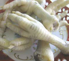 鸡脚、鸭脚含丰富的胶原蛋白,胶原蛋白在酶的作用下,能提供皮肤细胞所需要的透明质酸,使皮肤水分充足保持弹性,从而防止皮肤松弛起皱纹。用鸡脚烹菜肴,菜鲜味美,既不增加胆回醇,又不使人发胖,是很好的原材料。