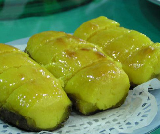 3.在一面板上撒上面粉,把土豆泥分成三份,全滚上面粉,用刀按成两头尖,中间宽的椭圆饼形,用刀在中间按一条约,在边上再交替的安几个短纹;呈树叶状。