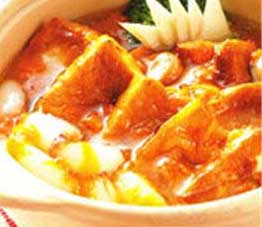 四神粉煲豆腐的做法是:将600克豆腐切块抹上少许盐,50克冬菇去蒂,20克胡萝卜切片。油锅烧热后,放入豆腐,稍油炸后捞起。最后,将豆腐、冬菇、笋片、胡萝卜放入煲锅后,再将酱油、料酒及调水后的四神粉倒入锅内。武火烧沸后,转文火煲1个小时,起锅前撒上葱花。