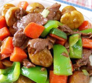 4、锅继续烧热,再加上葱段、胡萝卜、青椒,急炒,倒入板栗, 再将爆好的牛肉片倒入,随即放入调料,再炒片刻,关火装盘即成。
