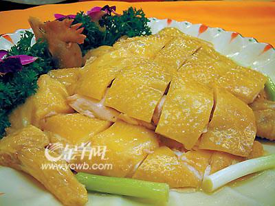 出品这一菜式的汇景花园酒家位于江湾桥脚的基立道,酒楼的前身原是一旧民居,老板承租后,对其进行大刀阔斧的翻修,现已呈花园式的园林酒家布局。据驻店经理介绍,该鸡与原“鹿鸣”的市师鸡系一脉相承,不过现已改名为“汇景金牌鸡”。大凡吃过市师鸡的都知道,市师鸡好吃的秘诀就在于酱油,离开了酱油,市师鸡无非就是普普通通的白斩鸡一碟;有对于此,该酒家在对鸡味的改良上,除了采用“市师鸡”以往的烹制方法外,还佐以新调制的酱料,食味上胜过传统的“市师鸡”。不仅如此,在吃法上也做了改进:将斩件上碟、有芡汁淋在鸡身的市师鸡,蘸上秘制的葱油、蚬蚧同时夹而食之,鸡肉更显脆嫩软滑,味蕾回味久远。(文/陈国华)